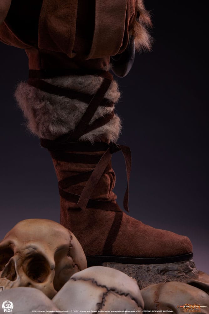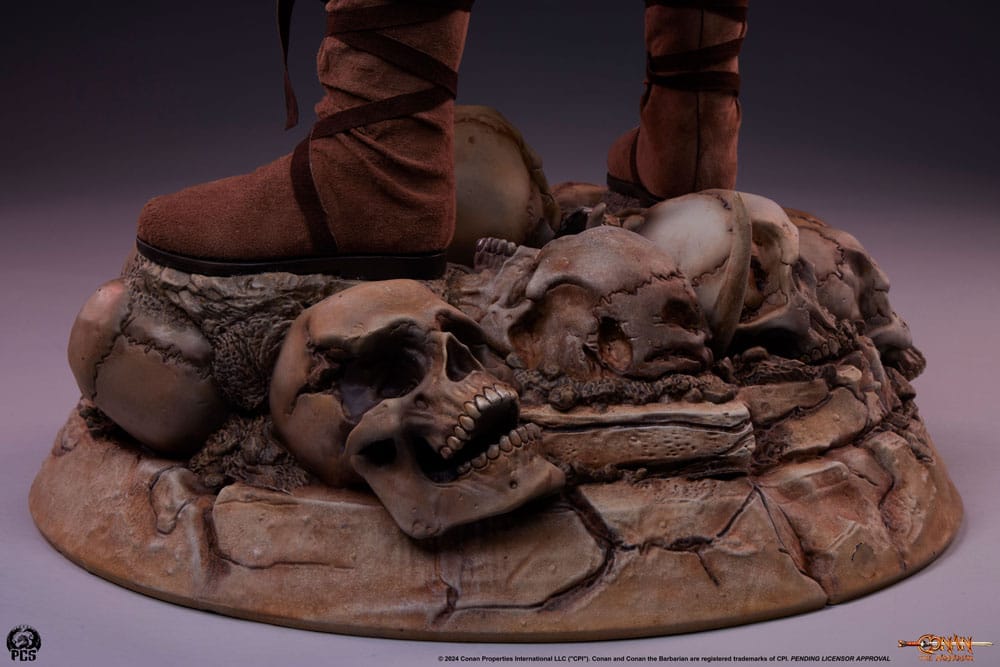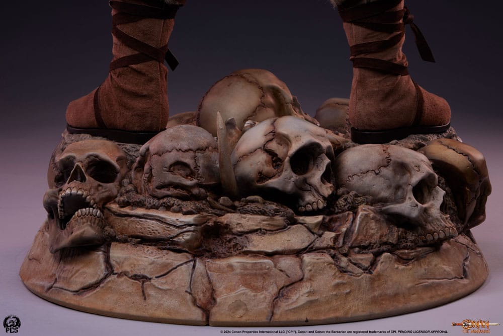 Clutching the Atlantean sword with both hands before him, every muscle in Conan's body appears ready for the next challenge that awaits him. The beautiful paint work on the statue emphasizes the expertly sculpted musculature of this larger than life warrior. Standing atop an environment base littered with skulls, Conan appears ready for his next adventure.