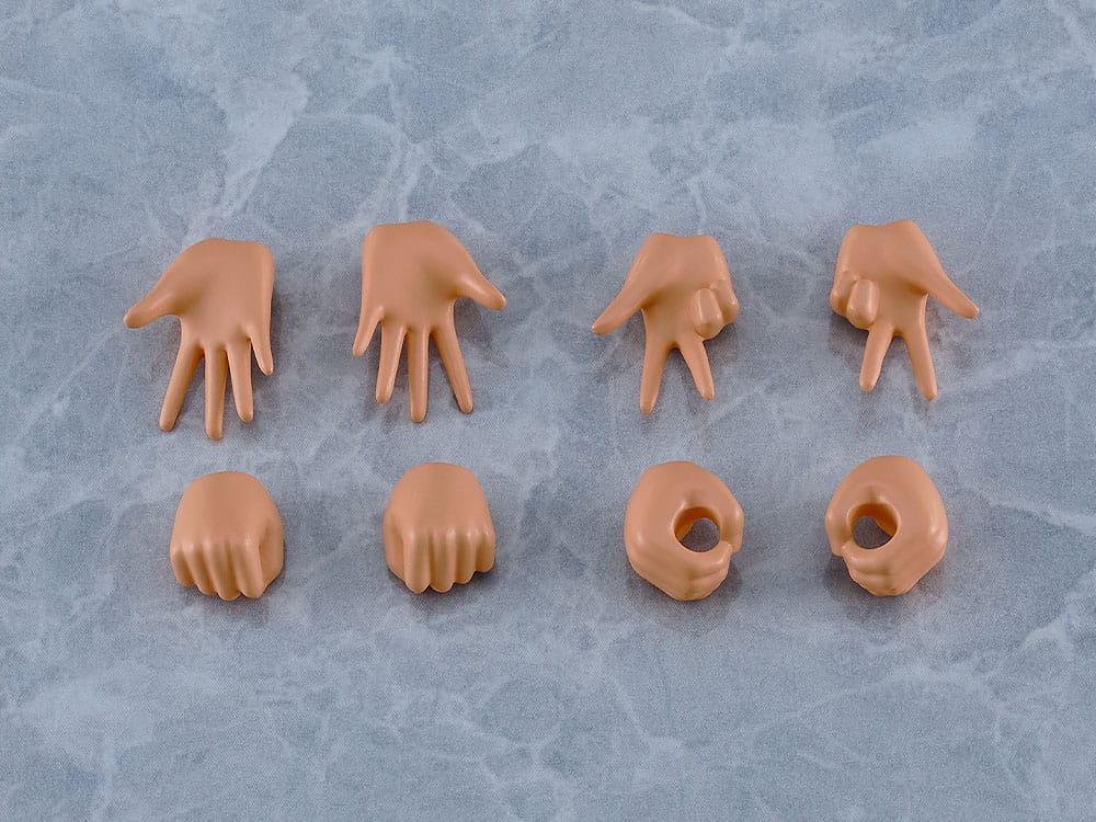 - The model comes with four types of hand parts: closed hands, open hands, peace sign hands and gripping hands. The holes for the gripping hands measure 3mm in diameter, allowing the model to hold items that are compatible with the hole size.