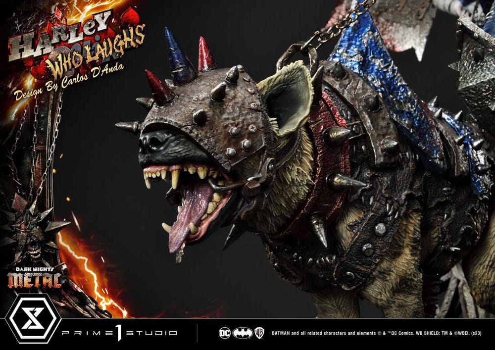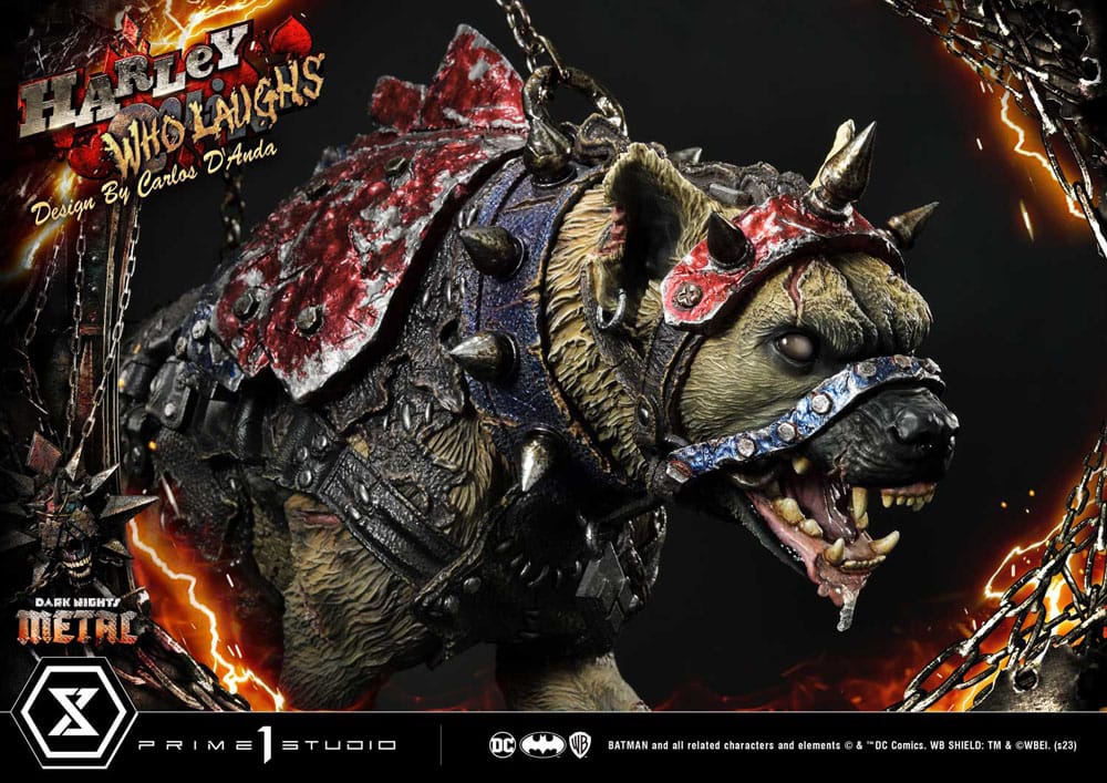 At a whopping 30 inches tall, Harley Quinn Who Laughs is brought to life in her signature red and blue costume, beautifully rendered in metallic and leather textures, a form-fitting ensemble that accentuates her dark allure. The generous use of spikes exudes an air of danger and rebellion, how metal! Her face is encased by an iron caged-style mask, a twisted fusion of metal and darkness that instills fear at its very sight. Alternatively, another swappable head portrait is available for you to display on a headstand, revealing the beautiful face beneath the mask, her peculiar face paint contoured by golden locks. The Queen of Chaos strikes an imposing presence, dark chains in her left hand, holding back her hyenas Bud and Lou. Their eyes gleam with savage hunger and snarling expressions, ready to unleash a brutal and merciless fate upon their prey. She holds a massive meat cleaver that is still dripping with fresh blood. At her feet is a heavy metal ironclad base of pure despair, rubble, chains, blood stains, and skulls, just the right combination to make your skin crawl.