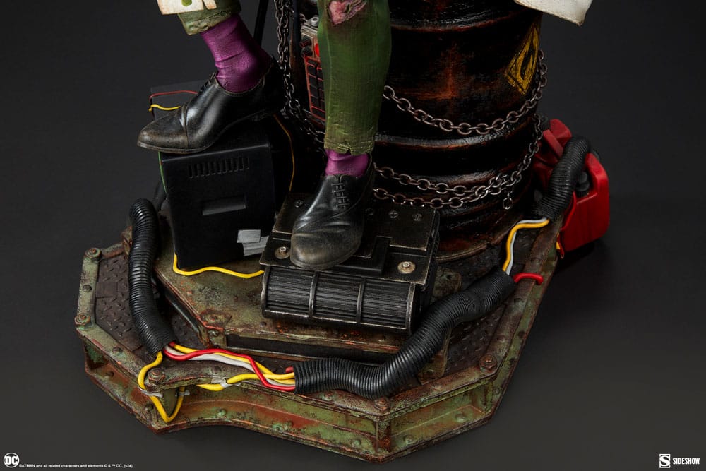 The Riddler Premium Format Figure measures 19.5" tall, 11.8" wide, and 14.3" deep as an egotistical Edward Nygma taunts Batman from atop a lacquered black barrel. Sinewy and sociopathic, the master strategist holds a good old fashioned paper riddle in one hand and a detonator in the other. The Riddler has purposefully put himself front and center in this rusted warehouse. Clues and threats - including Wayne Tower security footage and blueprints, an electronic keypad, a question mark cane, generators, gasoline drums, chains, and wires - are piled high. Now Riddler's got Batman right where he can see him put together all the puzzle pieces ... or die trying.