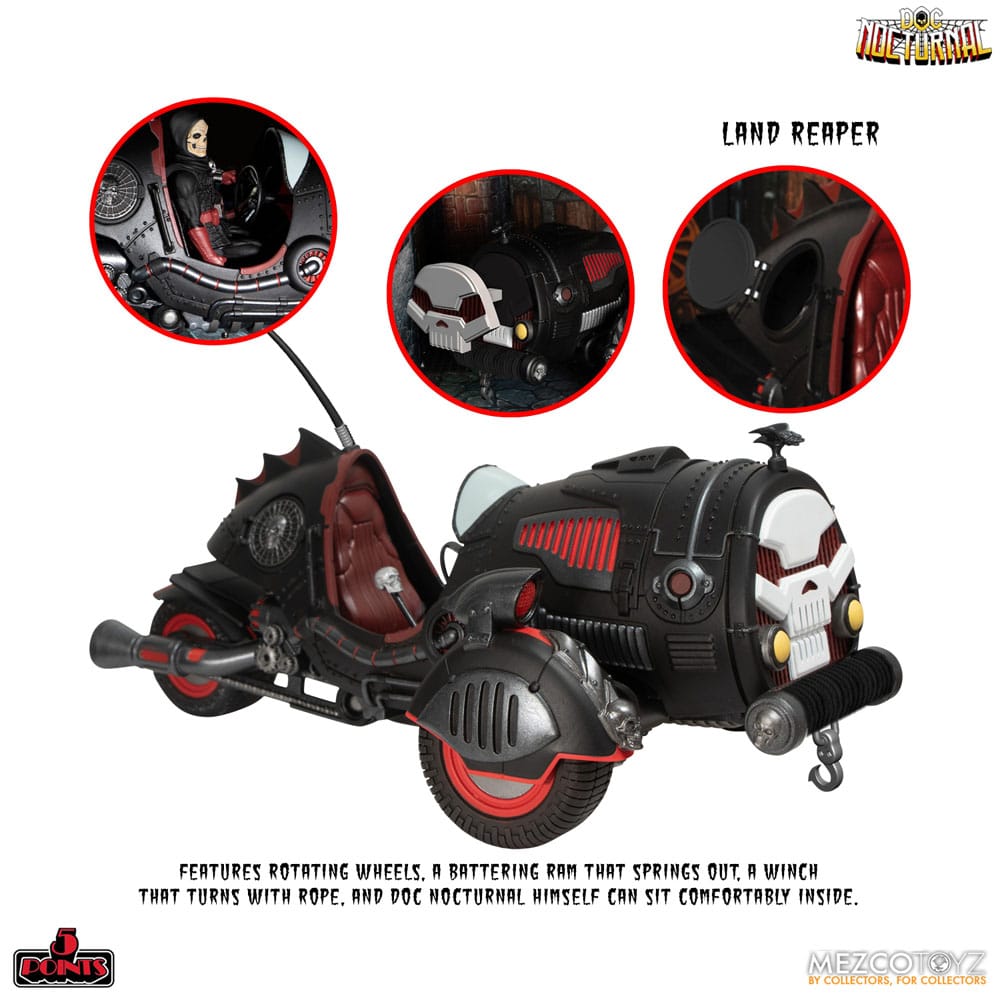 - Land Reaper - Doc Nocturnal's tri-wheeled terror of the roadways! The Land Reaper includes a spring loaded battering ram, working winch, free rolling wheels, and secret storage.