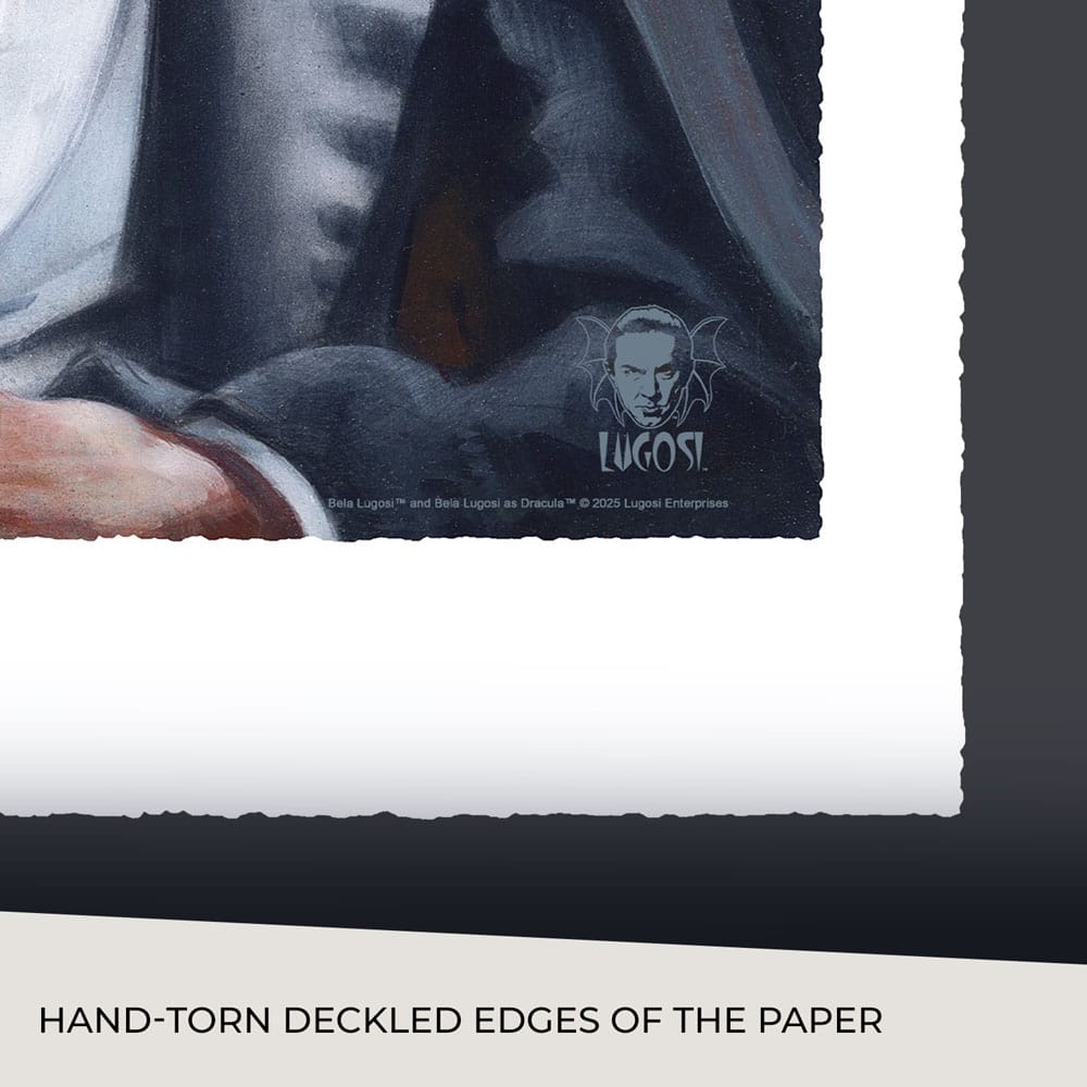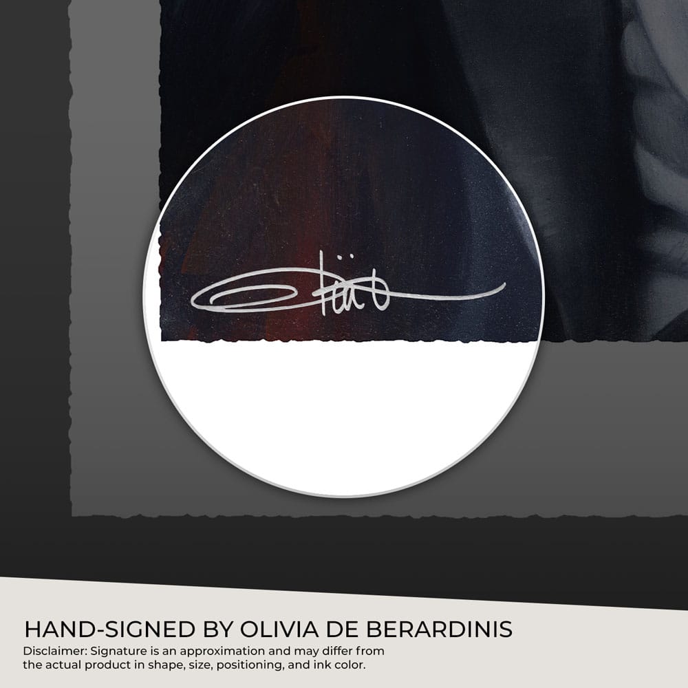 Inspired by Dracula (1931), this giclée print features hand-torn deckled edges and is offered unframed or in a custom framed presentation with a double mat design. Each Count Dracula Fine Art Print is hand-signed by Olivia herself and includes both Olivia's embossed Seal of Authenticity and a signed Certificate of Authenticity as a part of the limited edition of 200 pieces. Certified archival materials ensure your horror artwork will retain the strength of the vampire for centuries to come.
