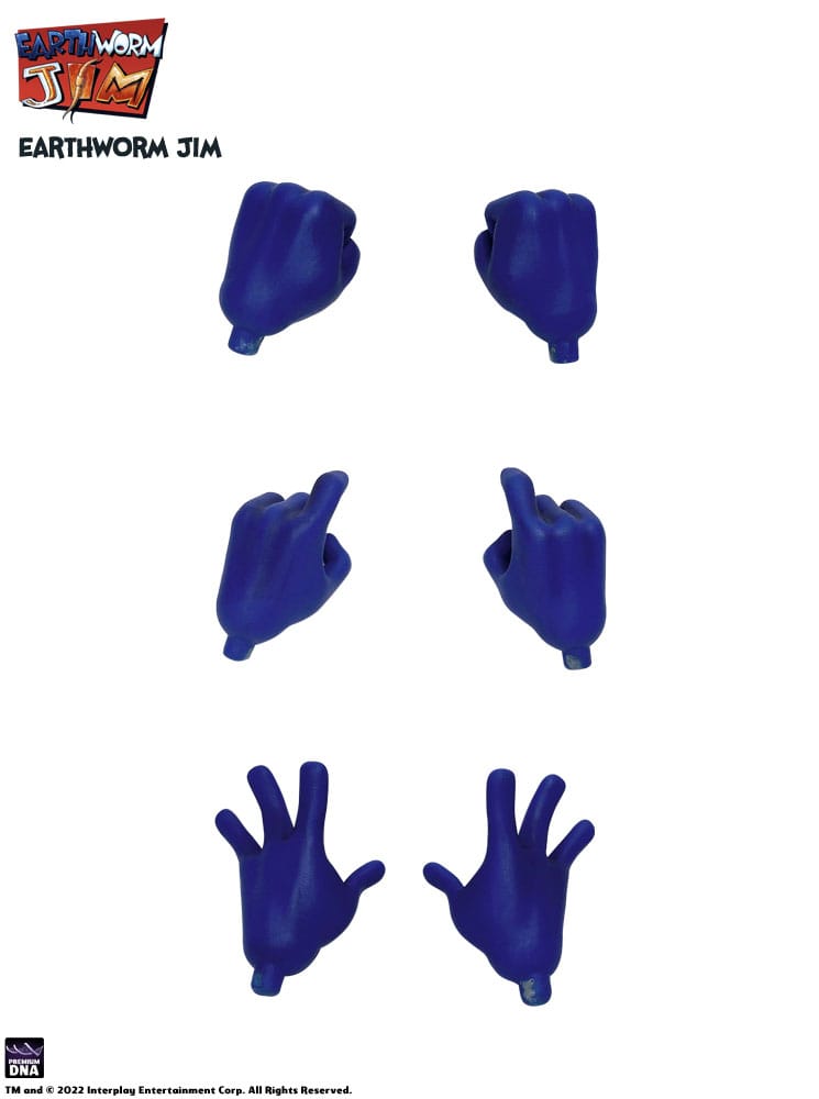 The groovy new Premium DNA 1/12 scale Earthworm Jim action figure stands 6" tall. He features 30 points of articulation, and includes his trusty blaster, 3 Snot companions (standard, neutral backpack insert, and action pose backpack insert), 3 sets of hands, figure stand, and 3 swappable heads.