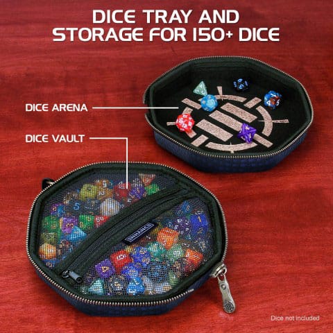 Beautifully designed with stylish metal accents, the ENHANCE Dice Case is the perfect addition to your collection of RPG accessories. The dice case is two products in one, with one half safely storing 150 dice and the other functioning as a tray to be passed around the table or held onto for personal use.