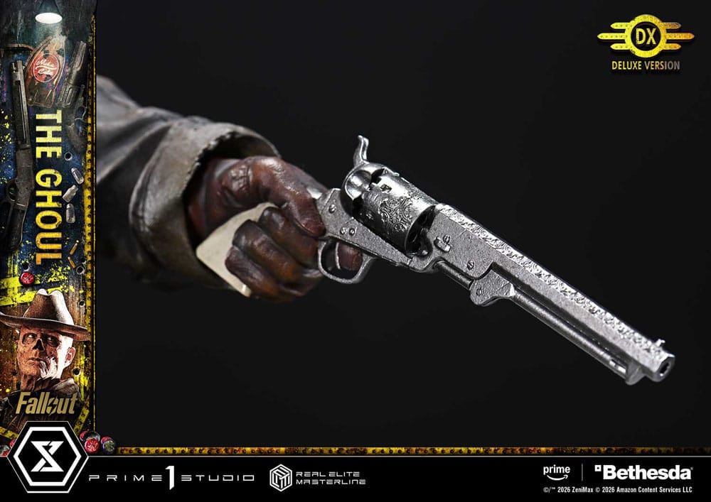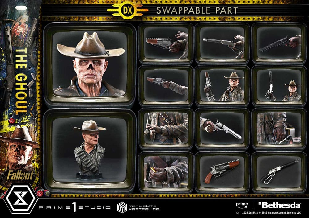 "Well, maybe not, but I'm gonna make myself welcome." A rogue bounty hunter, brought to life with the Wasteland's reality. Fallout is a post-apocalyptic ensemble drama where brutal violence and black humor swirl together. From the live-action adaptation of the long-running RPG comes one of its central figures, The Ghoul-now joining the Real Elite Masterline lineup. His presence, feared by all across the Wasteland, is captured with exquisite precision in 1/4 scale. The pose, aiming The Ghoul's Revolver from the hip, evokes the unforgettable shootout in Filly. From the arch of the torso to the fanning left hand, every detail has been refined to create a taut, suspense-filled balance. An exposed nasal cavity, parched skin, and a cold, ruthless glint in the eyes. Into this feral-worn portrait, we poured state-of-the-art sculpting and paintwork. From the frayed long coat to the glossy holster, his Western style is rendered with meticulous texture and aging. And with swappable parts, you can also arm him with The Ghoul's Lever-Action Rifle. The specially designed base is composed to reflect his outlaw way of life. Dogmeat standing close at his side. A weathered Nuka-Cola refrigerator. A television with an LED-lit screen showing pre-war star Cooper Howard. Each element draws a story into your display. A rich set of additional parts further expands play value. Scanning the surroundings while taking aim. Reaching for the next round. Unleashing a storm of gunfire with black and silver single-action revolvers. Bring a wide range of gunfighting moments to life. Together with Lucy and Maximus, who will join the lineup in the future, this is a must-welcome addition to your collection. " Specifications: - Fallout-Themed Base - 2 x Swappable Heads (Right-Facing, Left-Facing) - 3 x Swappable Right Arms (Shooting from the Hip, Horizontal, Raised) - 3 x Swappable Right Hands for Shooting from the Hip (The Ghoul's Revolver, The Ghoul's Lever-Action Rifle, Single-Action Revolver [Black]) - 1 x Swappable Right Hand for Horizontal (The Ghoul's Revolver) - 2 x Swappable Right Hands for Raised (The Ghoul's Revolver, The Ghoul's Lever-Action Rifle) - 3 x Swappable Left Arms (Fanning, Shooting from the Hip, Lowered) - 2 x Swappable Left Hands for Shooting from the Hip (Single-Action Revolver [Silver], Cartridge) - 1 x Head Stand - LED Illumination (Television) LED Power Supply Method: TBD * Please prepare batteries, USB cables, or other necessary items depending on the final power supply method.