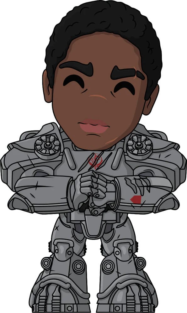 Suited up and ready to throw-down, Max is prepared for all out battle with his arrival at Youtooz! With his head cocked to the side and holding his fist threateningly at his front, he stands at 5 inches tall with a pink scar resting over his nose as his short black hair sits atop thick eyebrows. Wearing a full body of grey power armour with thick protective shoulders and sturdy wide feet, you can tell he's seen his fair share of battle as it is covered in deep gouges and scratches across its surface. The exterior of his packaging shows a full Power Armor suit sitting inside a dark metal enclosure. The Interior is a dirty grey cement with blue and yellow vault colors painted across the top, which continues onto the protective sleeve as his figure can be seen through the large clear window at its front. This collectible ships in a matte, embossed, protective outer sleeve and a custom-sized plastic protector for maximum protection during shipping.