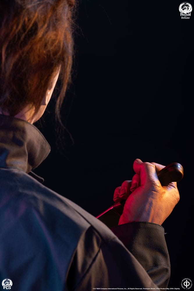 Premium Collectibles Studio presents the Michael Myers Life-Sized Bust Deluxe Edition based on the classic 1978 horror film, Halloween. This 34.5" tall bust will bring an eerie atmosphere to any horror collection, combining an expertly sculpted recreation of Myers' iconic mask with high end finishes on the mixed media clothing and lifelike hair. Michael's head is cocked to the side just slightly giving him an unsettling, curious appearance sure to unnerve even the steeliest horror hound. The Deluxe Edition boasts a full torso allowing Michael to clutch his signature knife in his hand adding an extra layer of terror to this life-sized collectible. This version is situated on a simple museum style base measuring roughly 13" wide and 9"deep. Add the true face of evil to your collection and pick up the Michael Myers Life-Sized Bust Deluxe Edition by PCS today!