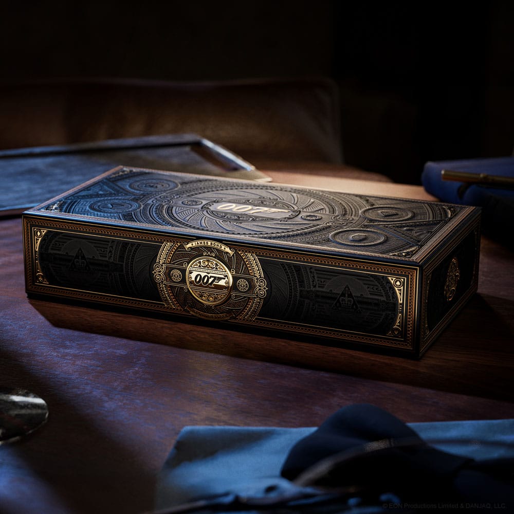 A special edition box set with a secret compartment, unlocked using a solid brass, handcrafted 007 pen. Inside are three decks of James Bond GOLD Edition Playing Cards.
