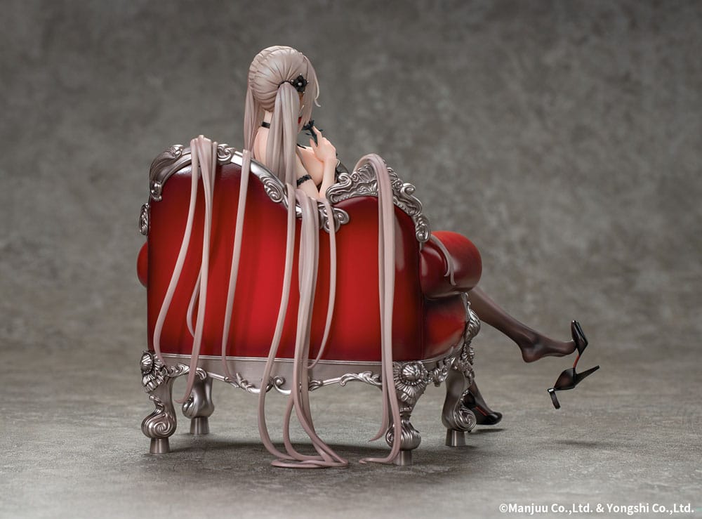 "Formidable: Rose Ceremony Ver.", from the popular mobile game Azur Lane, is coming out as a 1/7 scale figure based on the sixth anniversary illustration. Formidable sits on the sofa in a side pose, long hair flowing, holding a rose. The black evening gown outlines her perfect figure, while semi-transparent stockings showcase the curves of her legs. Be sure to add this beautiful rendition of Formidable to your collection