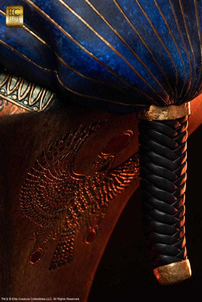 Horus is one of the great deities of ancient Egypt, typically figuring as a falcon or a falcon-headed man. Egyptians viewed Horus as the protector of the Pharaoh and the ruler of the gods. The Eye of Horus is an ancient Egyptian symbol of protection and of royal power from the deities. Now, the artists at ECC are turning toward ancient mythology and reimagining these characters. Combining a fascination with the natural world, the intricacies of geometric design, heroic tales of gods and monsters, and a passion for the human form and the Classical Style, the Horus bust is one of the most carefully yet subtly conceived sculptures ECC has created to date. The Horus is the third character designed and created by Miyo Nakamura for ECC's Myth line, succeeding the ECC Anubis. Here is what Miyo had to say about the process:''Having the opportunity to sculpt Horus was a special moment of synchronicity. As falcons flew above me, I knew I wanted to connect with him next. His hood of Lapis Lazuli represents strength, courage, royalty, and wisdom, which encompasses the characteristics I wanted him to imbue. Being a shapeshifter, he can fly the skies in his falcon form, showing us the importance of having a bird's-eye view of things. His energy is that of strength and power, yet there is a choice to be gentle and kind. He showed me to be curious about the world through his piercing eyes. To have Horus's attention, creating space for me and to connect with his energy was the greatest gift he could have given me, teaching me that our presence is our most valuable commodity. Limited to 199 pieces worldwide! Specifications: - Attractive art nouveau themed 'Myths' display base - Cast in high-quality resin - Handmade glass eyes - Each Certificate of Authenticity is signed by Miyo Nakamura - Limited in production to 199 pieces worldwide! - Size: 80 x 40 x 33 cm