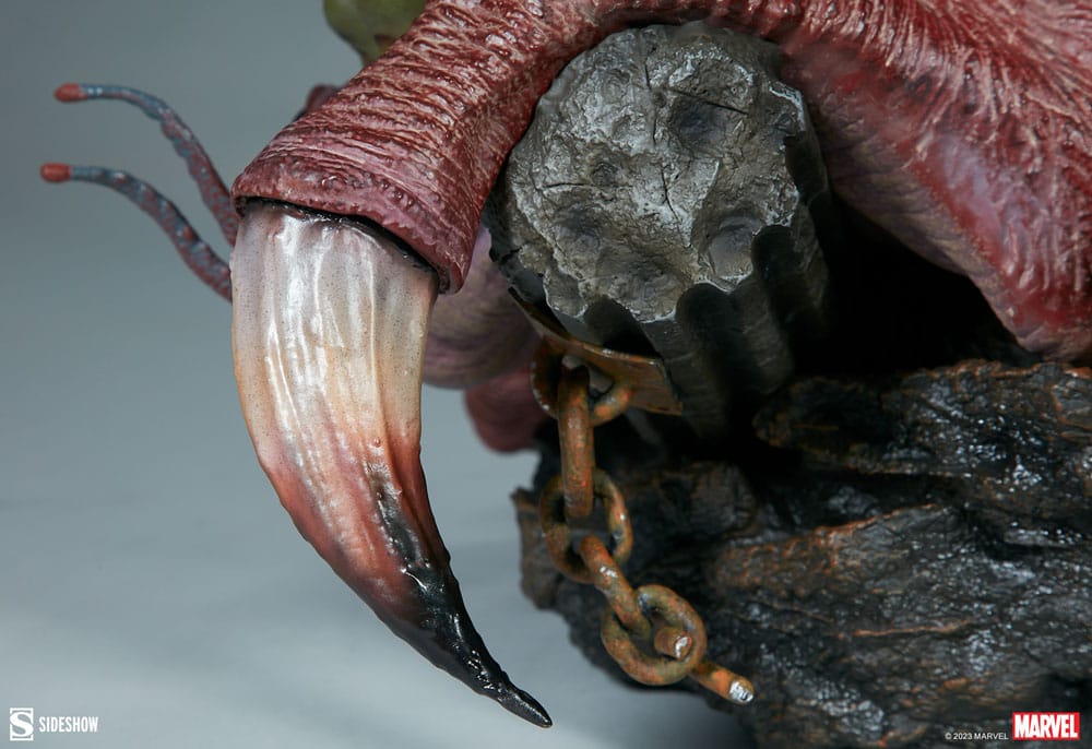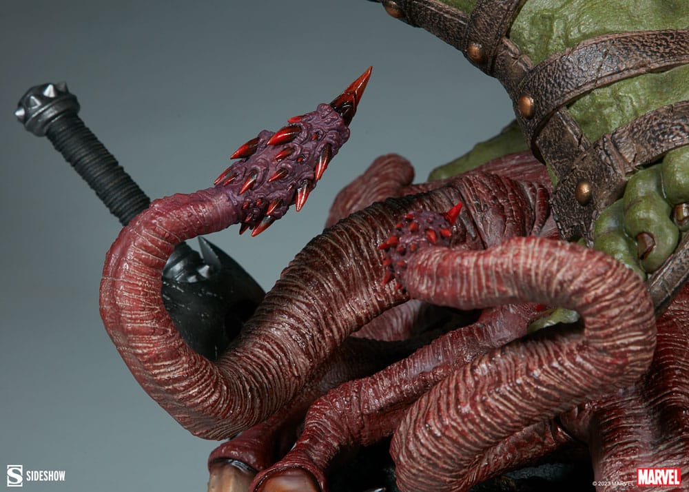 Inspired by the iconic Planet Hulk storyline, the Gladiator Hulk Maquette measures a monstrous 26" tall as the jade giant smashes a helpless alien fighter into the dirt of the Sakaarian coliseum. Barbed tentacles and claws are no match for the giant gladiator as he pummels his extraterrestrial enemy into a broken stone pillar on top of the battleground base. His alien enemy features a detailed design, with red textured skin and a multitude of glistening eyes.
