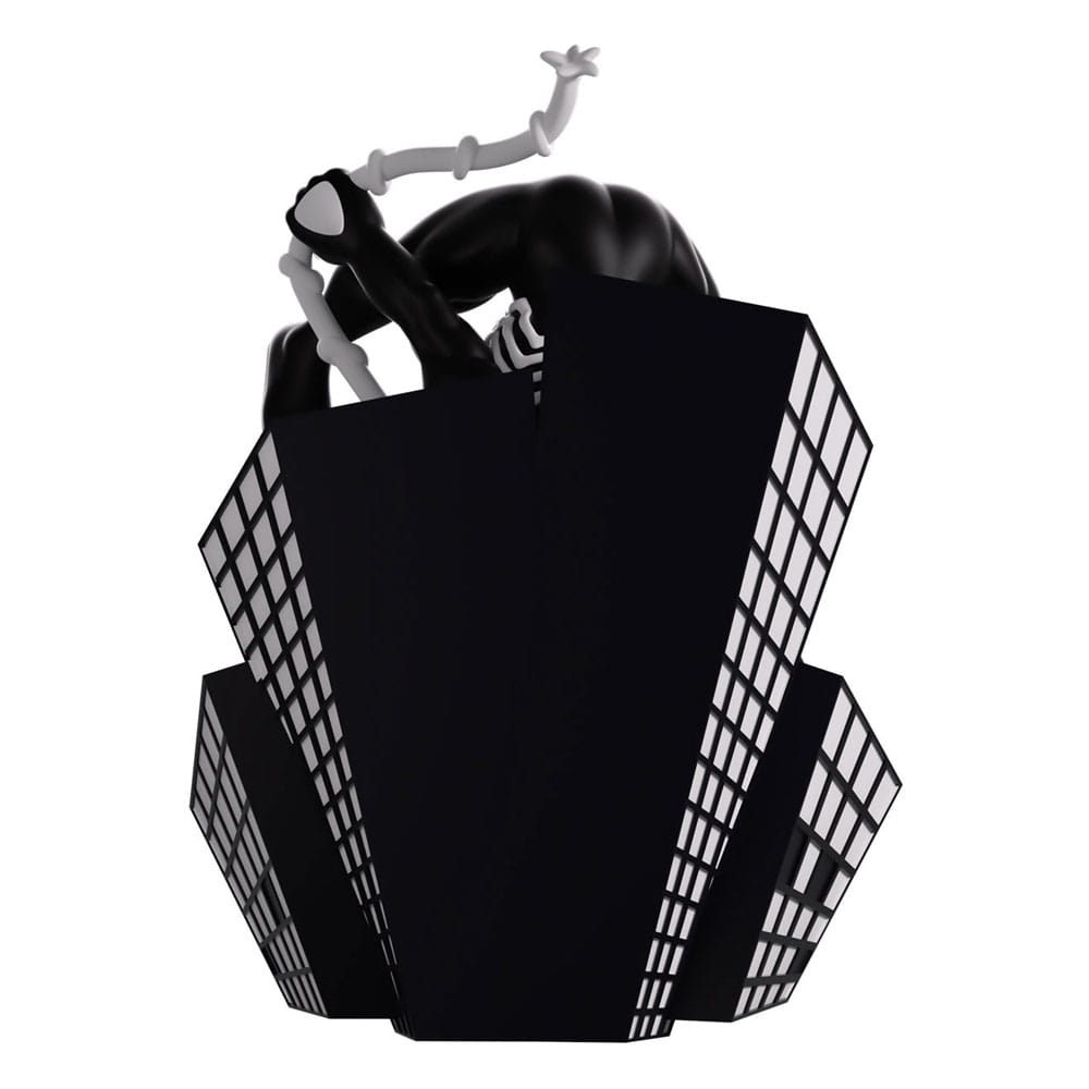 Now this is a spectacular return to Youtooz if we do say so ourselves! That's right, Spider-Man is back with another vinyl figure! At 4.9 inches tall and posed in an acrobatic tumble as he swings through the abstract peaks of black and white skyscrapers, his body curls in the middle as he somersaults backwards and grips the end of a long curling web. With his body covered in a pitch-black suit that blends into the darkness of the night, his eyes, soles of his feet and the spider symbol that wraps around his chest are stark white. The exterior of his packaging sees a hole blown through a light green wall as pillars of smoke rise up from the rubble, while the interior is covered in the light grey panels of Marvel comics. The protective sleeve is then filled with a collection of vertigo-inducing black and white buildings as his figure can be seen through the large clear window at the packaging's front. This collectible ships in a matte, embossed, protective outer sleeve and a custom-sized plastic protector for maximum protection during shipping.