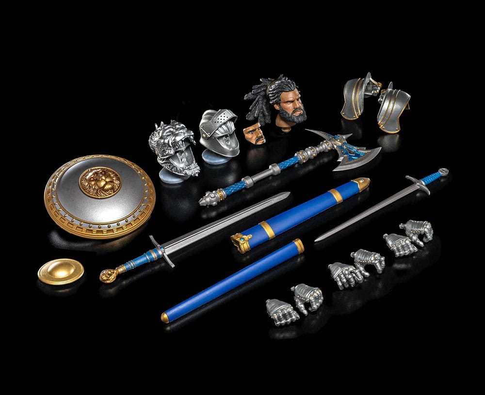 The Legacies of Mythoss: Otho figure comes with a newly sculpted head featuring this warrior's distinctive look. The set also incudes 2 brand new helmets with flip-down visors, both of which can be used with the Otho "face plate" insert that is also included! As for weapons, Otho v2 comes with a broad sword and scabbard, standard sword and scabbard, a shield with 2 middle inserts (including a Leodysseus lion symbol), and a new battle axe. He also comes with extra hands and premium wired soft goods tunic and skirt.