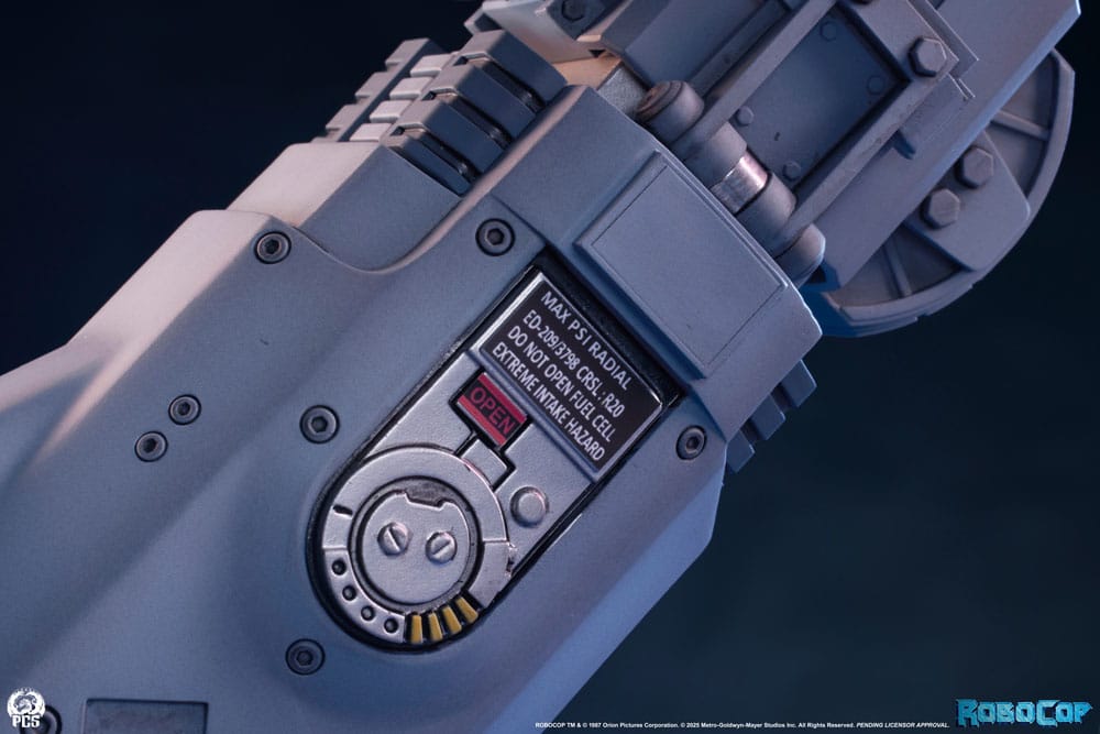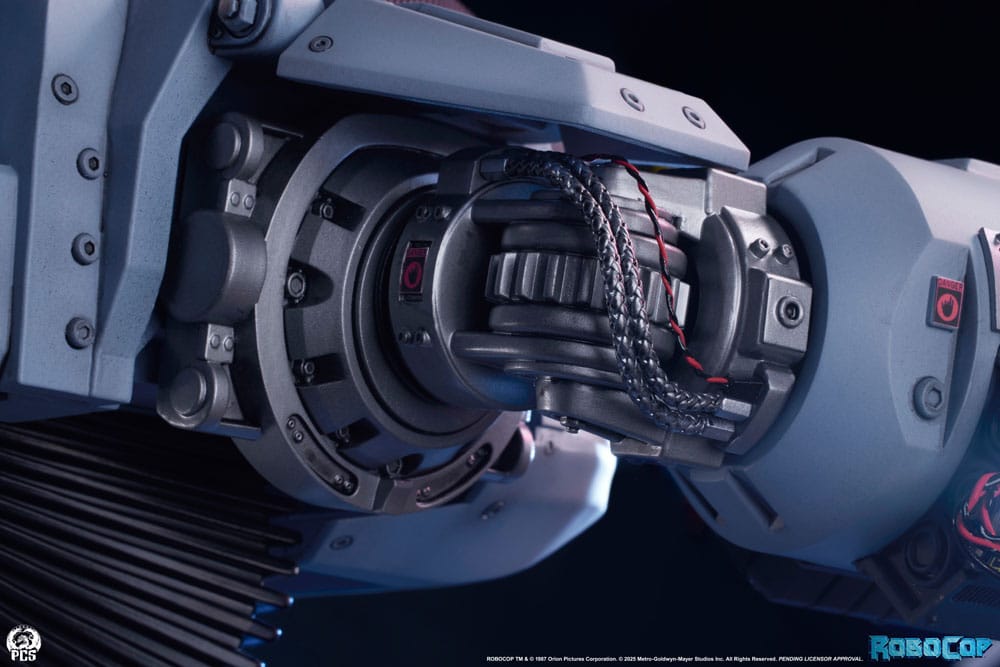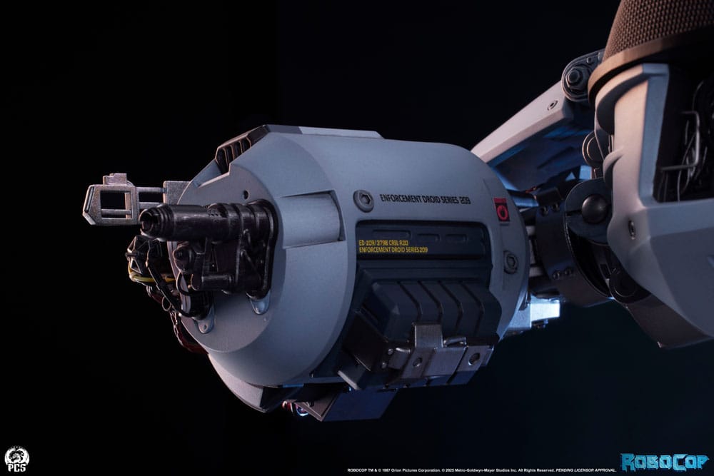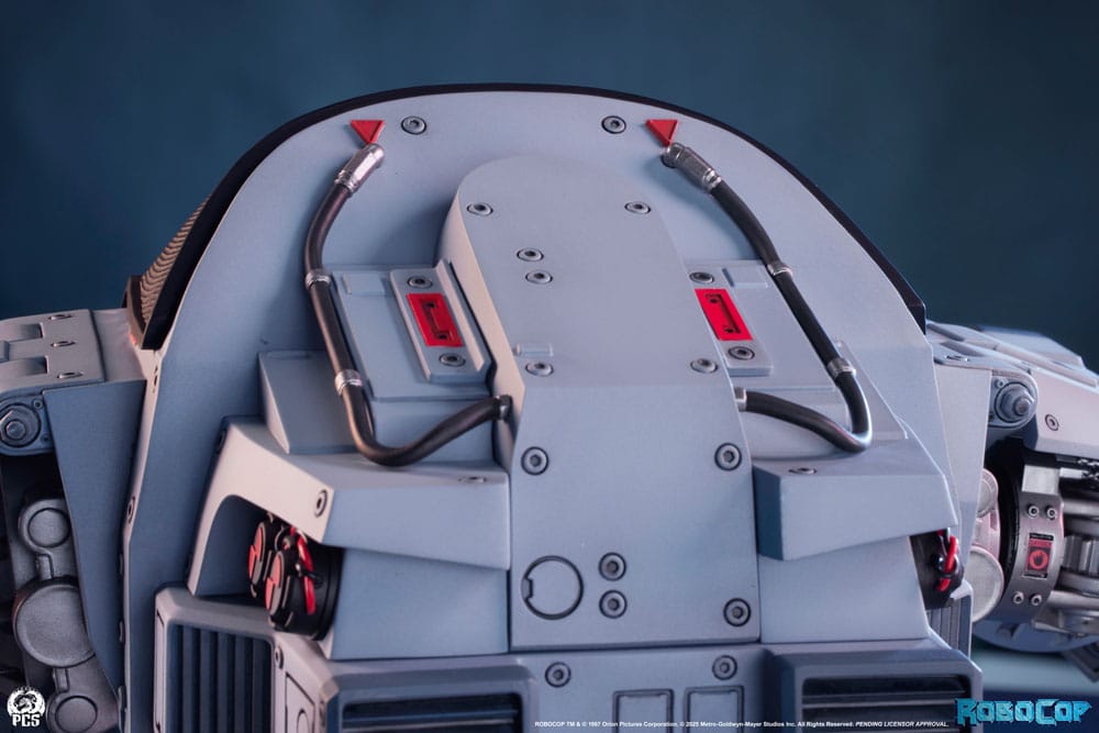 ED 209 stands atop a sleekly designed pedestal base featuring the OCP logo, armed and ready to pacify any perceived threat.