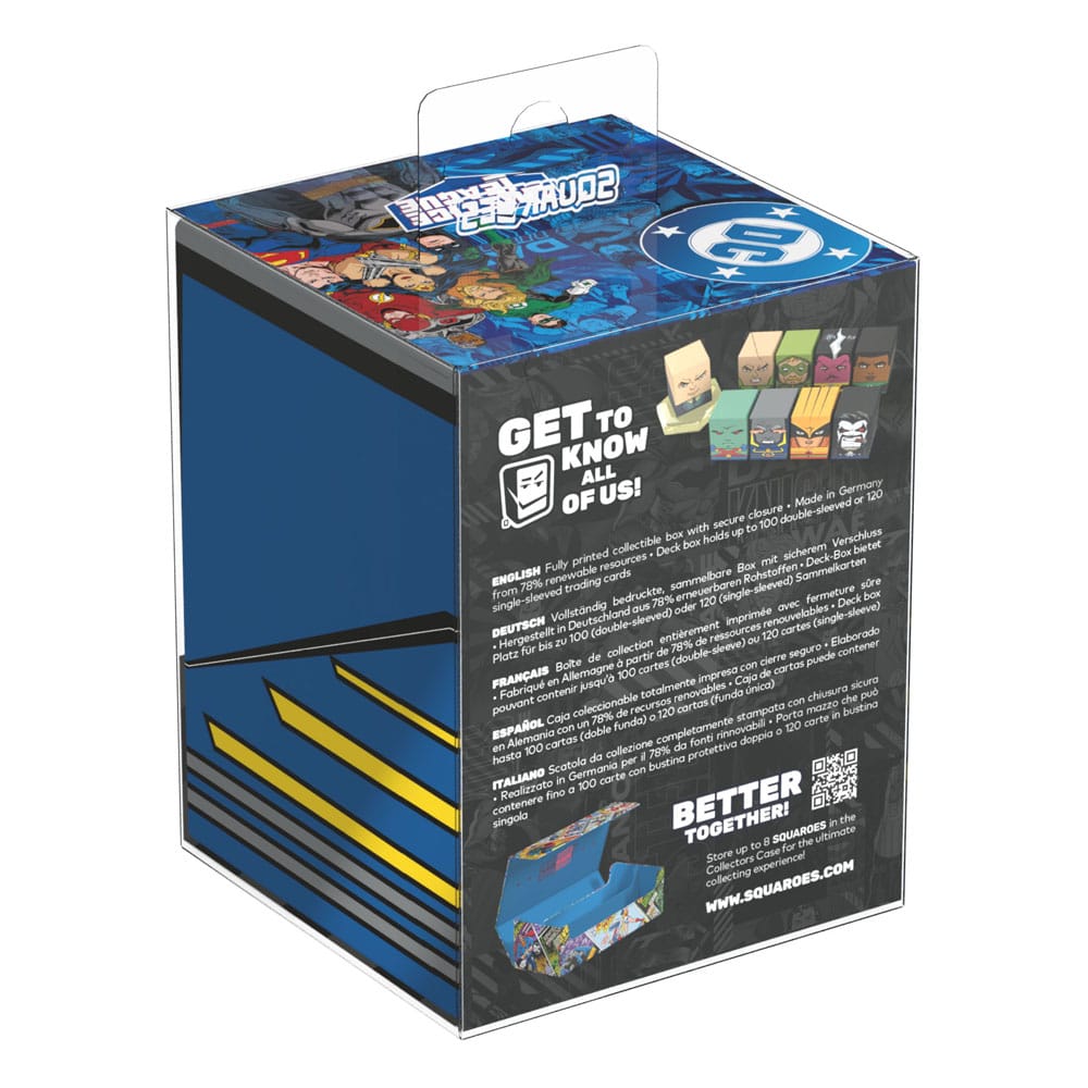 Collectible box for storing TCG decks, tabletop gaming accessories, and/or collectibles. The Darkseid™ Squaroe from the DC Justice League™ edition holds up to 100 cards in double protective sleeves if used as a deck box. Squaroes are made from 78% renewable recources.
