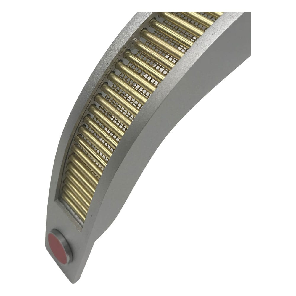 The frame of the replica is cast from an aluminum alloy, while the rods and wire mesh are made from brass. It also features magnetic red neural output pods with screen accurate red prismatic tape, with two options: protruding or recessed, as seen on screen in different iterations of the prop.