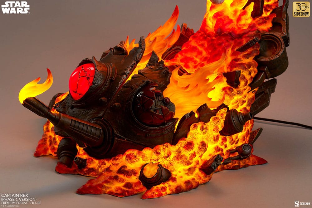Measuring 27" tall, 15" wide, and 15" deep, the Captain Rex Premium Format Figure wields dual blasters as he launches into the air above a scorched battlefield. Gray and white smoke plumes twist into the vibrant yellow and orange flames emitted from his jet pack. A broken and burned spider droid™, its pieces scattered and melted in the aftermath, bears the brunt of Captain Rex's effective assault. With this trooper in the sky, the victory of the Republic's campaign seems certain.