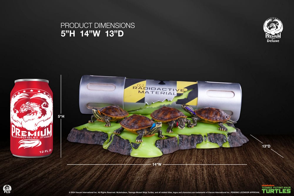 The TMNT: Origins Diorama is a fully sculpted collectible that measures 5""H x 14""W x 13""D recreating the moment young Leonardo, Raphael, Michelangelo and Donatello came in contact with the bright green ooze that would transform them into the Teenage Mutant Ninja Turtles.