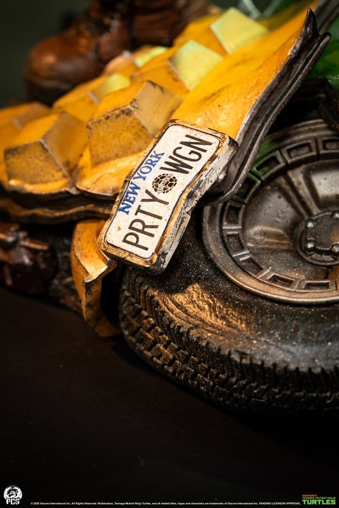 The hard hitting mutant rhinoceros stands an impressive 27" tall, fully equipped and armed for battle. Rocksteady stands ready for action with his heavy assault blaster in hand atop the wreckage of the Turtles' infamous party wagon vehicle.