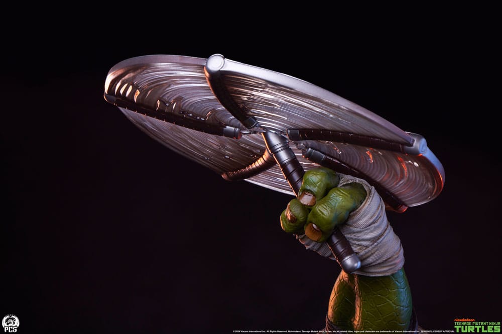 This fully sculpted statue features protective pads on his knees and elbows, cloth wraps around his hands and feet, and a leather belt decked out with a ton of pouches to hold his ninja accessories...or more likely, snacks. The wide grin on his face and his orange mask fluttering in the breeze enhance the sense of movement and fun that makes Michelangelo such a fan favorite.