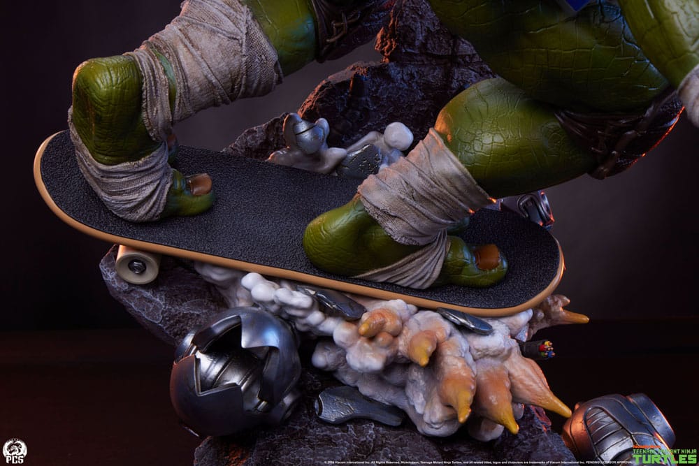 The Michelangelo 1:3 scale statue measures 26.5" tall and nearly 19" wide as this fun-loving turtle whirls his nunchucks while carving through the NYC sewer system on his skateboard.