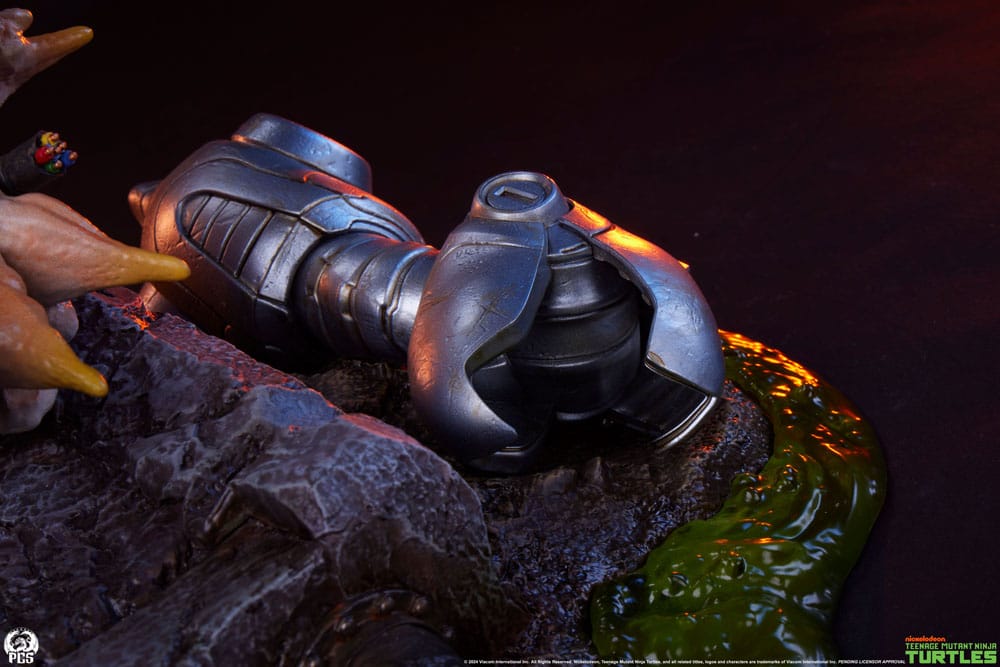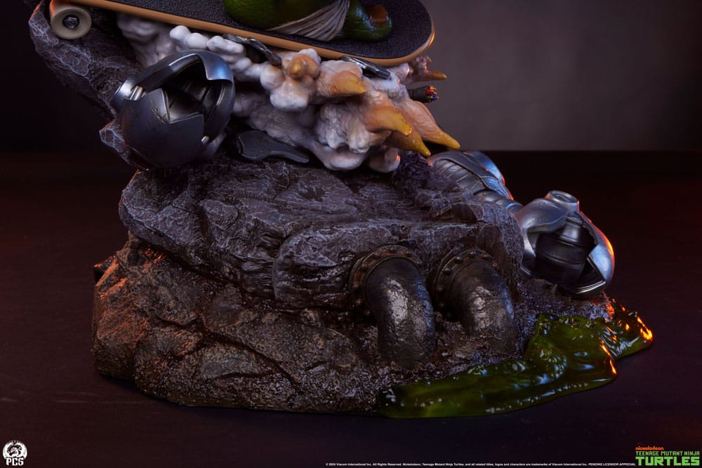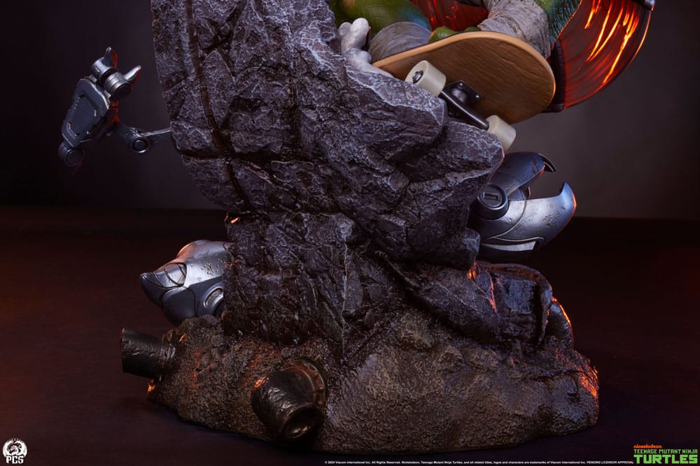 The Michelangelo statue is carefully crafted to showcase a stylized mixture between his more realistic and comic styled depictions. With detailed paint work and design, you can see each scale on his body, every cut of his shell, and his battle-hardened physique from his many clashes with the TMNT rogues' gallery alongside his brothers Leonardo, Raphael, and Donatello.