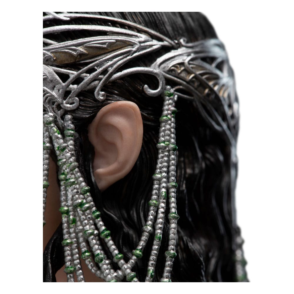 The eternal elf stayed behind, choosing instead to live the life of a mortal with her chosen love. After ages of trials, and the immeasurable weight of sorrow, Arwen, the illustrious elven maiden of Rivendell, now stands at the side of her beloved Aragorn as he reclaims the throne that has long been in abeyance.