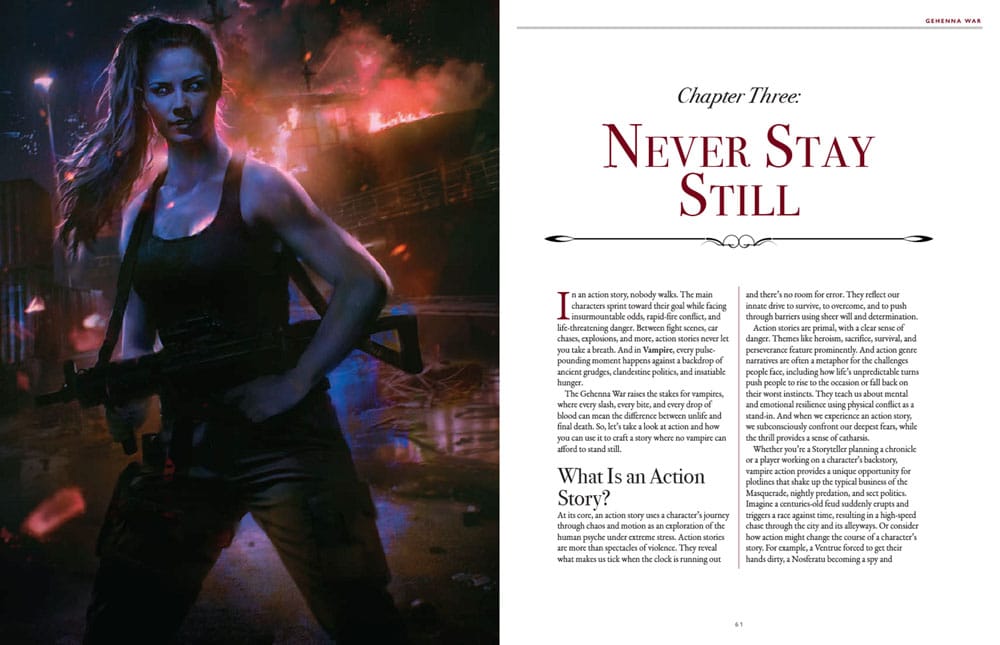 Gehenna War provides material both for players and Storytellers to make the game sing, focusing on fast-paced action and how to weave it into stories and chronicles.