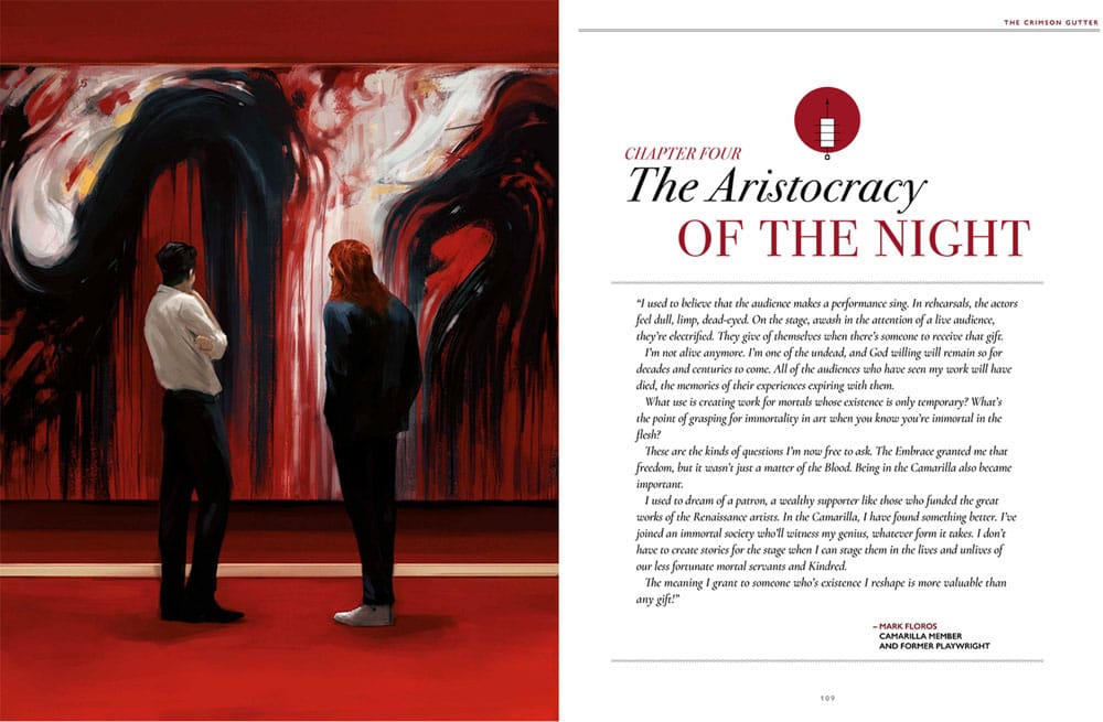 The Crimson Gutter provides a starter chronicle, designed to help novice or experienced Storytellers run any introductory game of Vampire: The Masquerade. The Crimson Gutter chronicle introduces core concepts during play such as feeding, the sects (Anarchs, Camarilla), and the Masquerade itself while giving the players' characters a chance to carve a niche for themselves among the Kindred.