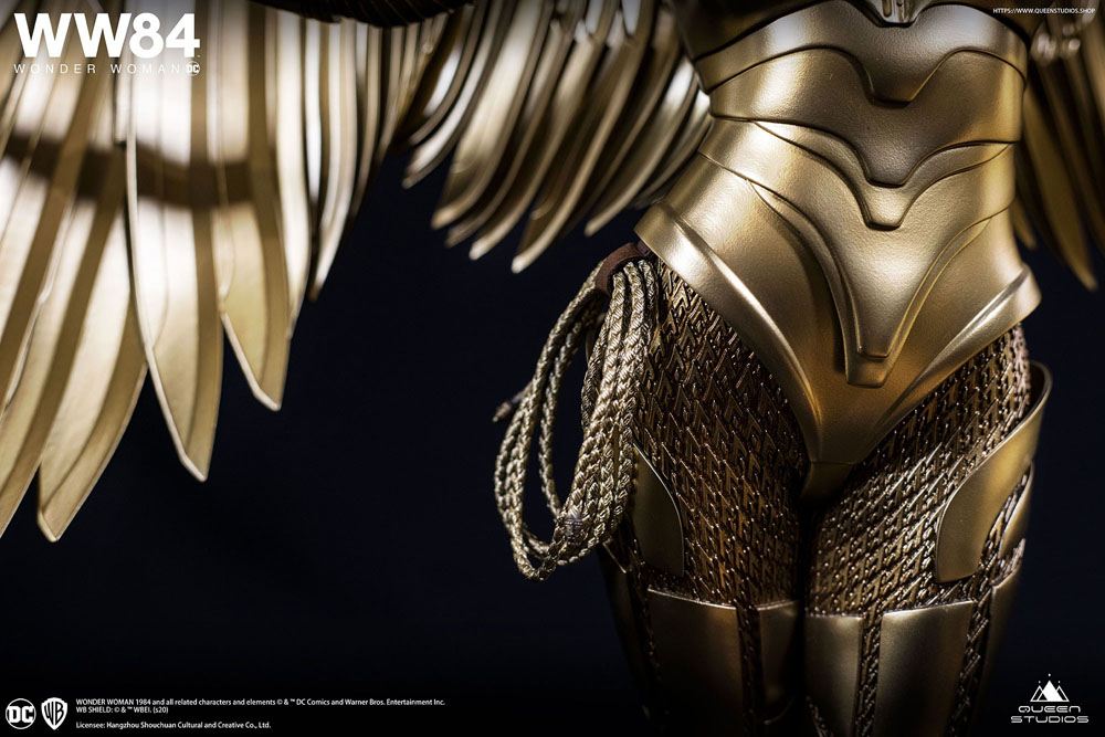 The pose the Queen Studios team have chosen shows Wonder Woman with her arms open wide and her golden wings spread majestically behind. As she looks up, she is majesty and power personified. The striking statue is accentuated further with incredible detailing throughout. No detail is spared as the finish on the paint creates a next level of realism as she stands atop a golden base.
